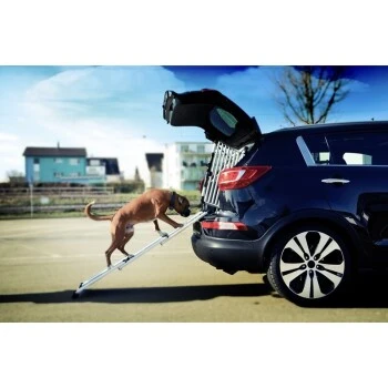 EasySteps – das Original aus der Schweiz, besitzt eine High-Tech Anti Rutsch Lauffläche, mit garantierter Trittsicherheit bei jeder Witterung. Die EasySteps Hunderampe wiegt nur 5,4 kg und ist garantiert bis 100 kg belastbar. Die 3-fach Teleskop Konstruktion ist mit nur einer Hand bedienbar. So können Sie auch auf vielbefahrenen Strassen mit einer Hand immer Ihren Hund kontrollieren. Easy-Steps ist sehr platzsparend und kann problemlos auch in Kombination mit einer Hundebox im Kofferraum verstaut werden. Stufenlos verstellbar von 71- 160 cm. Das einzigartige Gleit-Brems-Kontrollsystem schützt Ihre Hände vor Verletzungen und verhindert das ungebremste Ausfahren der Rampe. Gummifüße an beiden Enden der Rampe schützen die Stoßstange vor Kratzern und geben einen sicheren Halt auf jedem Untergrund.