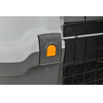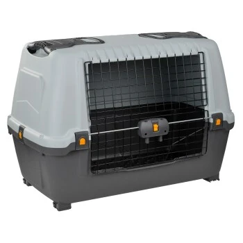 Auf der Vorderseite befindet sich eine verriegelbare, aufklappbare Metalltür – weitere Lüftungsschlitze sorgen für eine gute Luftzirkulation im Inneren der Transportbox.