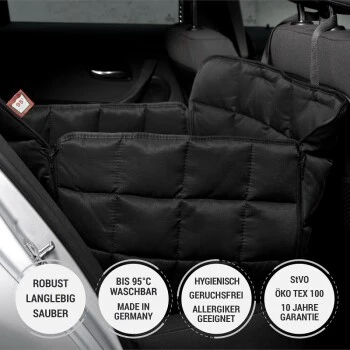 Ihr Hund sitzt in einem weichen und anschmiegsamen Kessel, in dem ausreichend Platz zum Liegen, Drehen und Sitzen bleibt. Natürlich gibt es eine Anschnallmöglichkeit nach StVO für die sichere Reise.